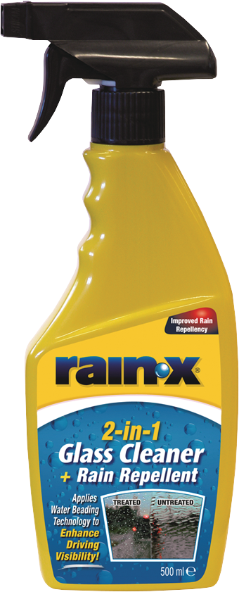 Rain-X 2-in-1 Glass Cleaner + Rain Repellent is a unique formulation that cleans vehicle glass to a streak-free finish removing bug residue and road grime from the glass. Glass Cleaner + Rain Repellent has the world renowned Rain-X Rain Repellent added so that once the glass is clean a treatment of the product is added thus repelling rain by causing water to bead up and roll away, increasing vision during difficult driving conditions.